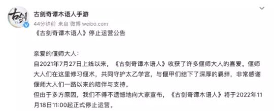 另一款宣布停运的则是网元圣唐的《古剑奇谭木语人》手游,这款去年七月份上线的作品也即将在今年11月18日停止运营。