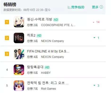 在8月底才刚刚开服的NEXON新作手游《HIT2》一上线便有了极好的成绩,游戏上线后立刻站上Google Play畅销榜前三,而在9月它更是登上了畅销榜第二,仅次于刚刚推出新卡池和新版本的《原神》。