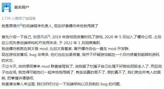 不仅如此,后续在知乎上,螺舟前任主程序还爆出当下《太吾绘卷》的主程序一边修BUG一边在网上甩锅,甩锅的对象就是这个已经离职了半年之久的前任负责人。